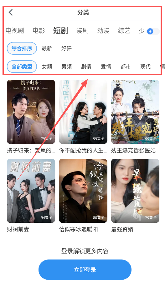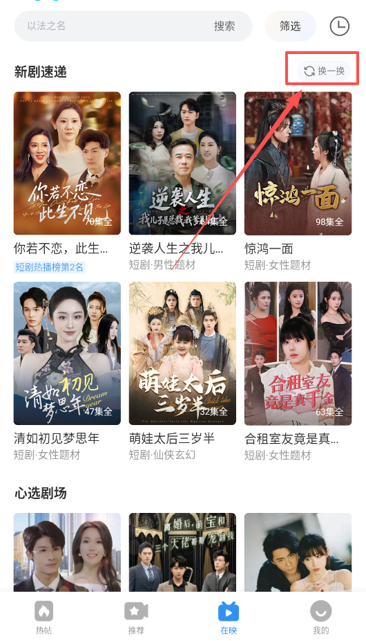 4、短剧专区更新很快,多使用“换一换”功能来刷新推荐列表,根据“男性题材”或“女性题材”等标签。