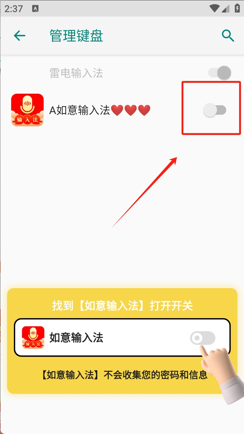 2、进入“管理键盘”设置,找到并开启“如意输入法”的开关。