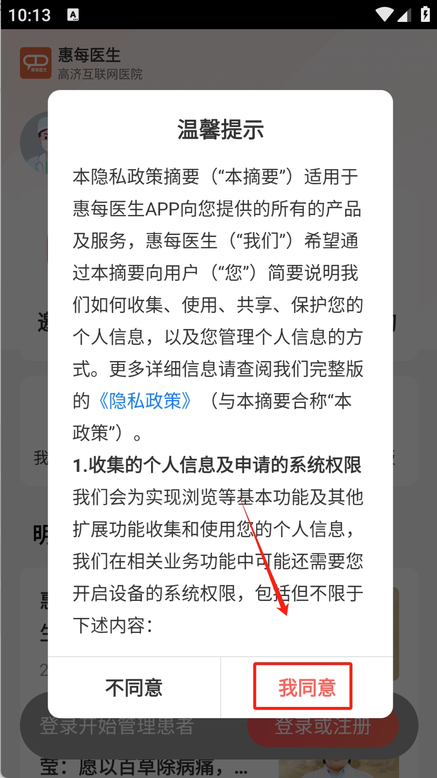 1、首先,阅读并同意隐私政策。点击“我同意”按钮,以继续使用惠每医生APP并获取相关服务。