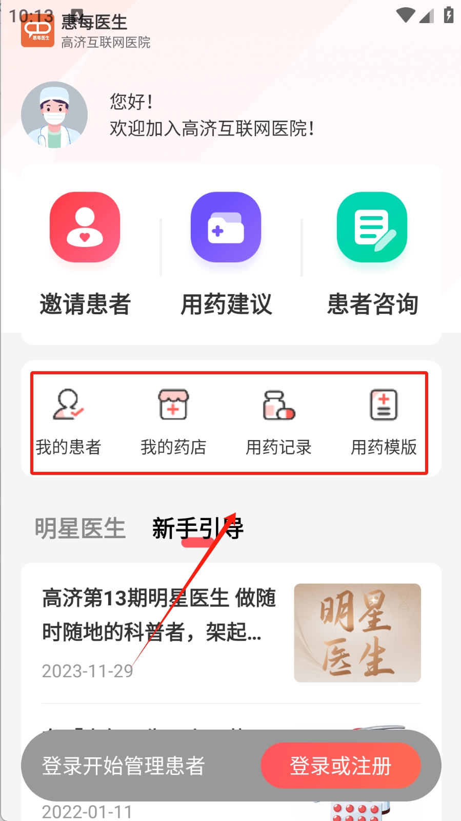 3、然后,熟悉APP的主要功能。在首页,你可以找到“邀请患者”、“用药建议”、“患者咨询”等功能按钮,点击相应的图标进入功能页面。