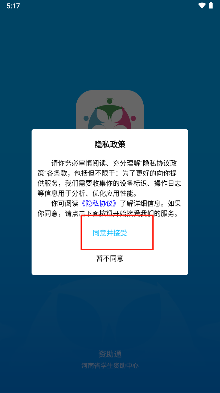1、阅读并同意隐私政策。点击“同意并接受”按钮,开始使用服务。