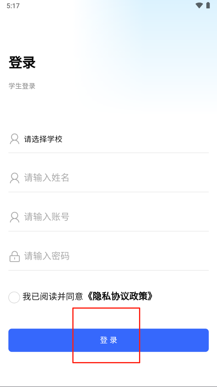 2、进行学生登录。输入学校、姓名、账号和密码,勾选同意隐私政策后点击“登录”。