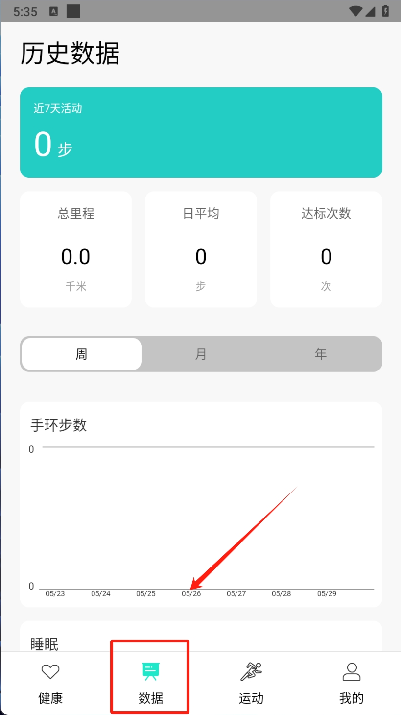 2、在数据页面查看历史活动数据。用户可以切换到数据页面,查看近7天的活动记录,包括步数、总里程等详细信息。