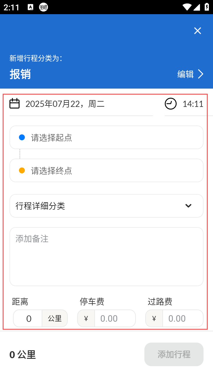 4、填起点、终点等信息,确认后点【添加行程】记录。