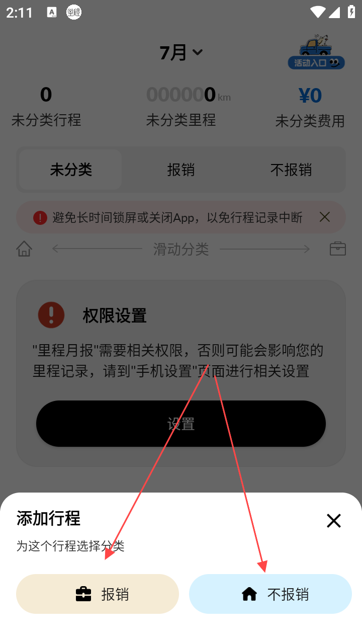 3、选择行程分类,按需点【报销】或【不报销】。