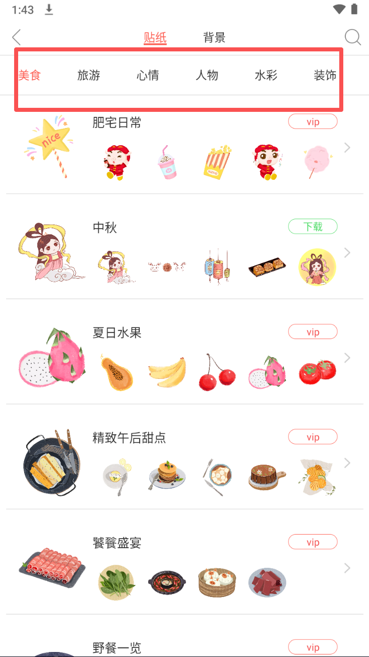 4、点击不同分类,如“美食”,浏览并选择您喜欢的素材。