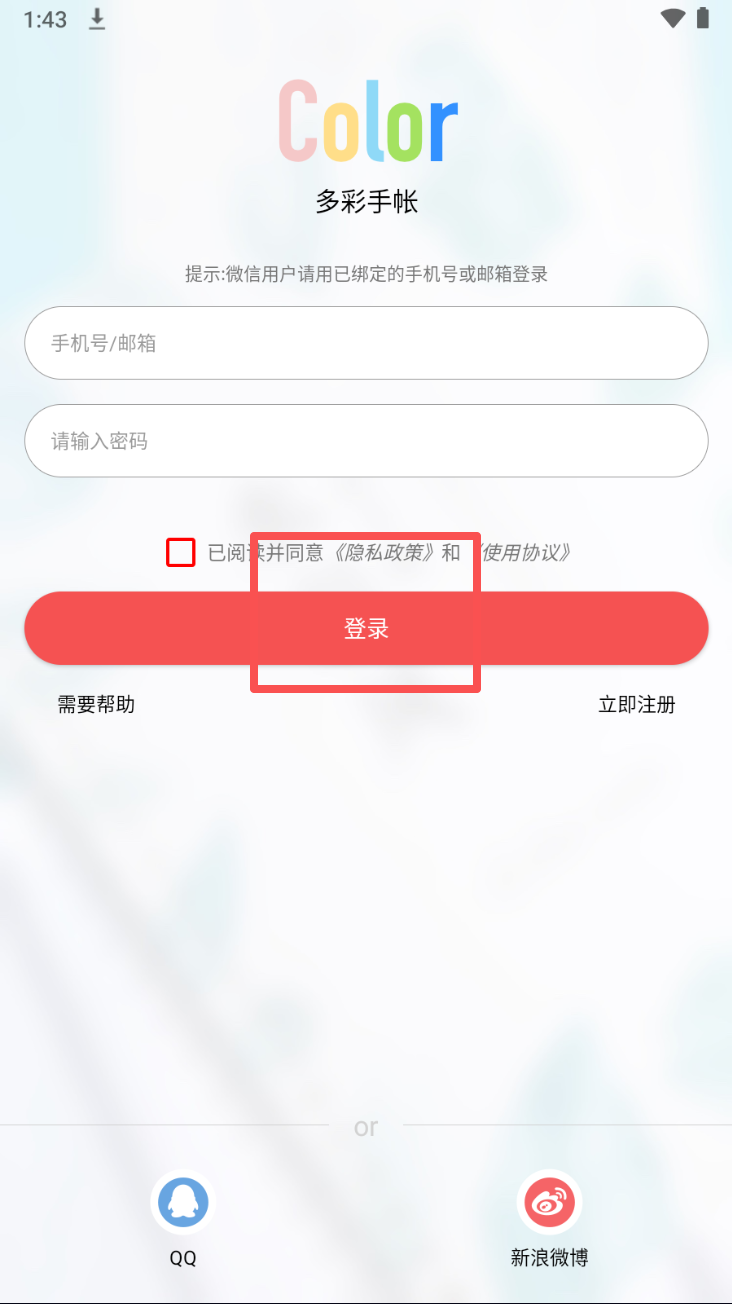 1、在登录界面输入手机号或邮箱,并设置密码后点击登录。