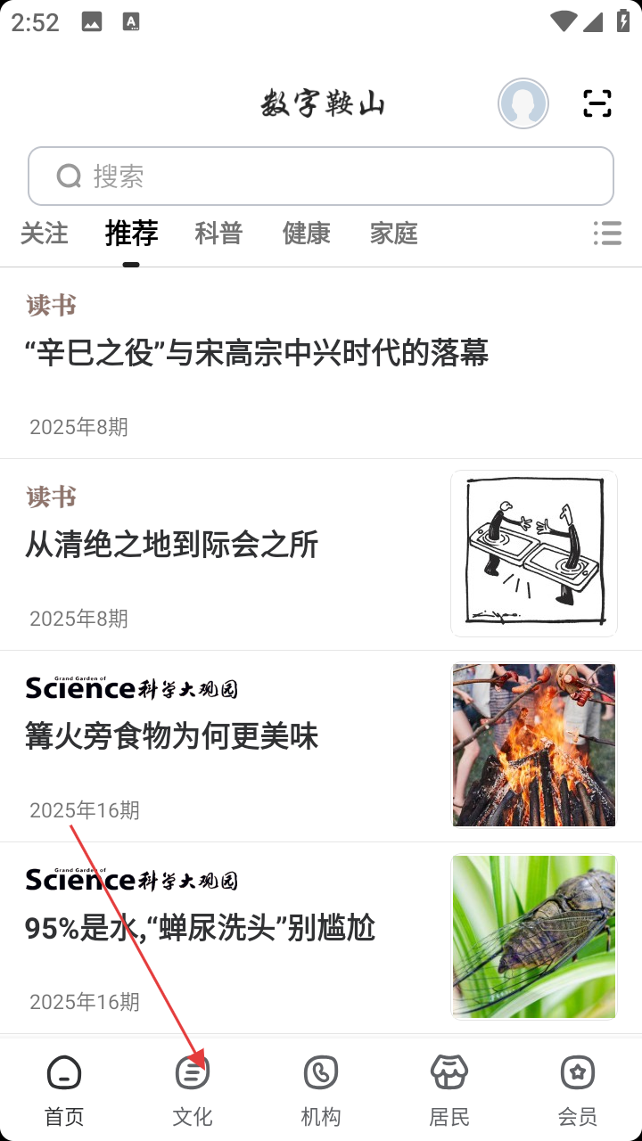 1、打开【数字鞍山】,点击底部【文化】,进入文化服务页面。
