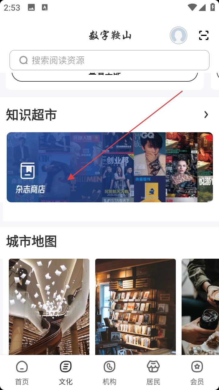 2、在文化页,选择【杂志商店】,浏览杂志资源。