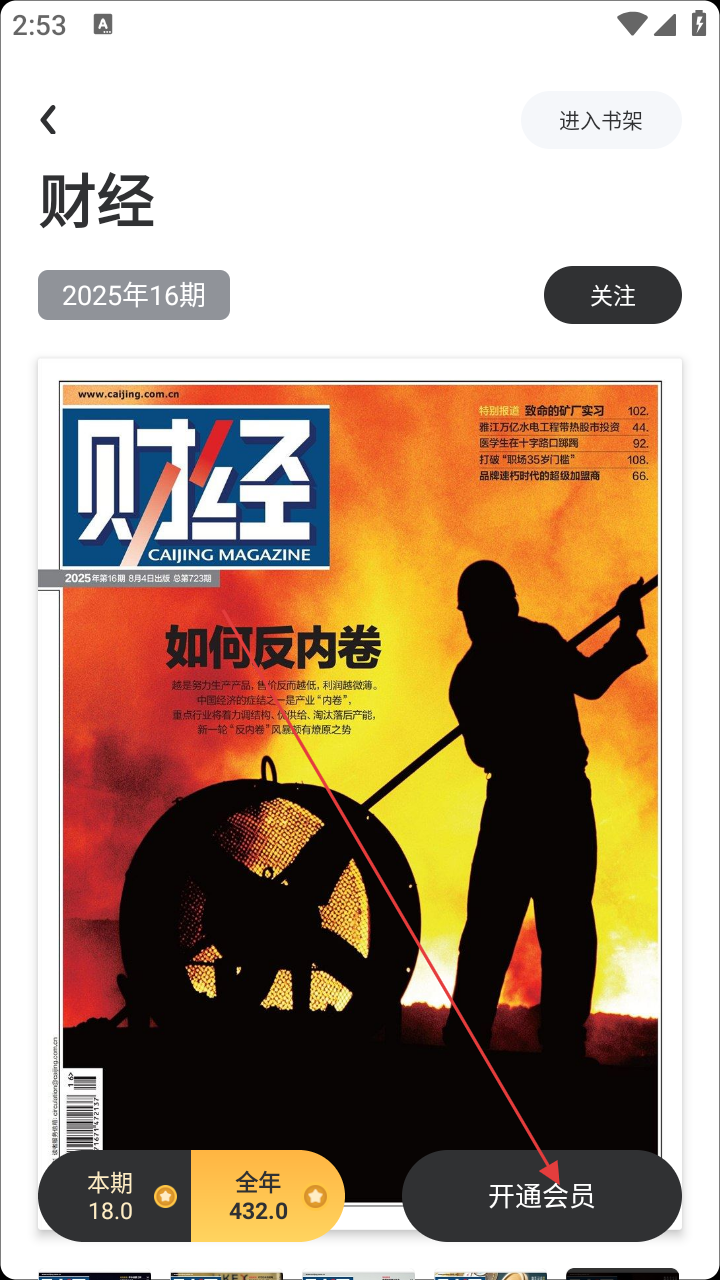 4、若想阅读【财经】杂志,点击【开通会员】,按需订阅阅读。