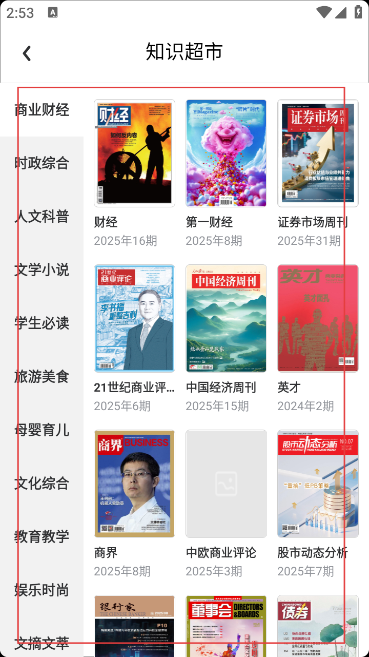 3、进入知识超市,按需选择【商业财经】等分类,查看对应杂志。