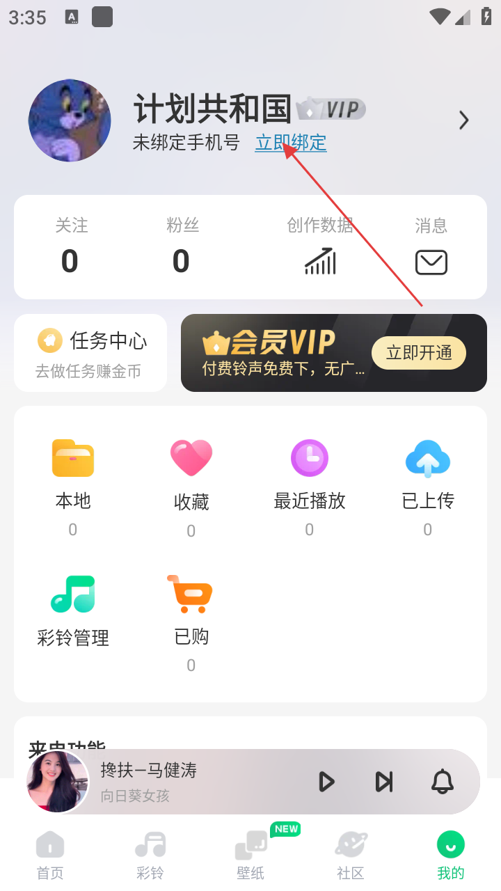 2、进入【我的】页面,若手机号未绑定,点击【立即绑定】选项,进入手机号绑定流程。