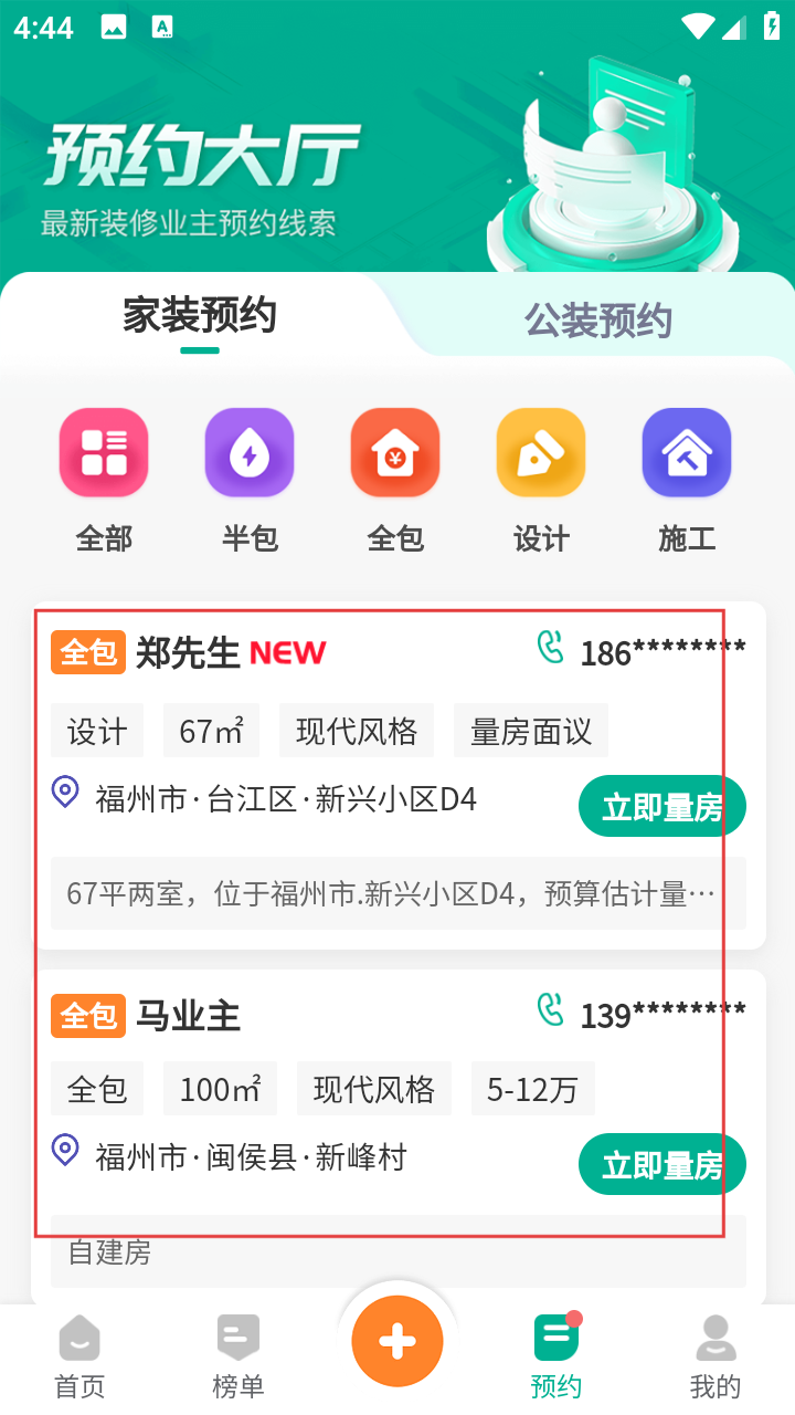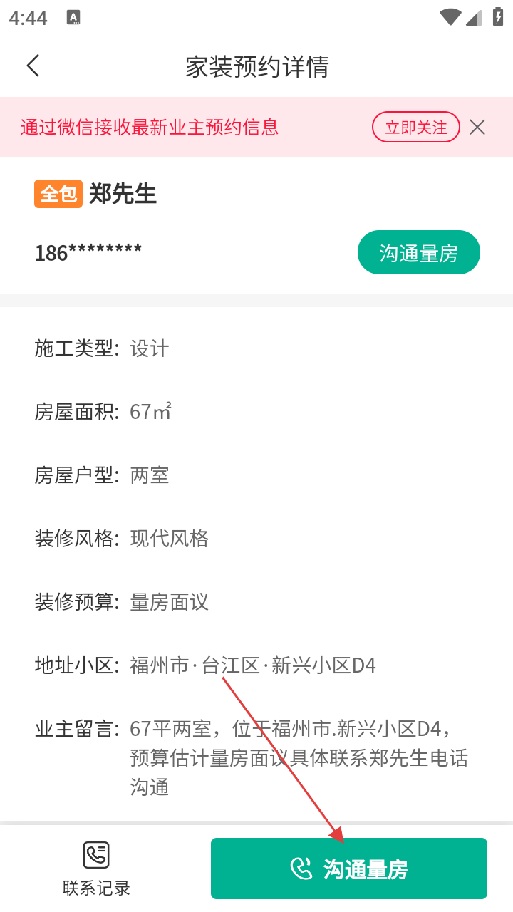 4、在【家装预约详情】页,确认信息后,点击【沟通量房】,联系业主沟通装修事宜。