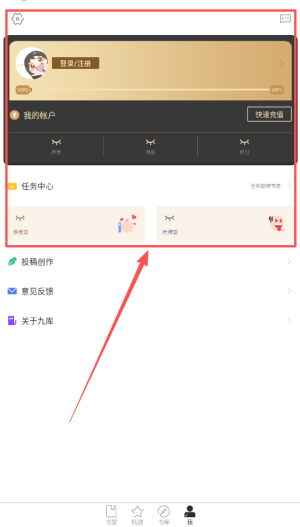 1、首先下载并安装九库阅读,通过简单的注册流程,即可进入丰富的小说世界,随时开启您的阅读之旅。