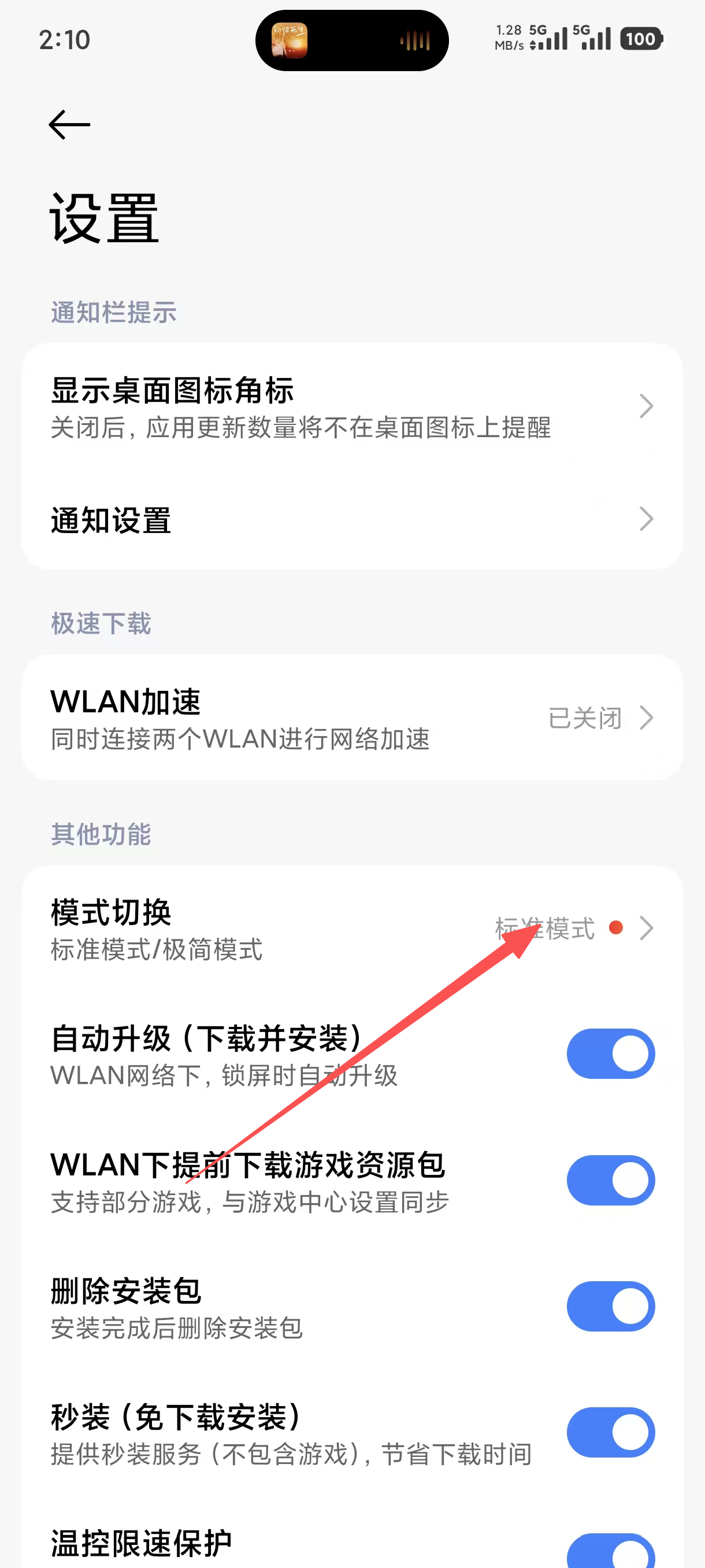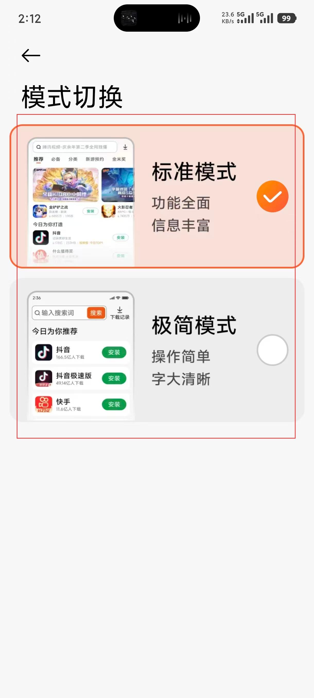 3、在设置界面中,点击【模式切换】选项,可进入模式选择界面,查看标准模式和极简模式的区别。