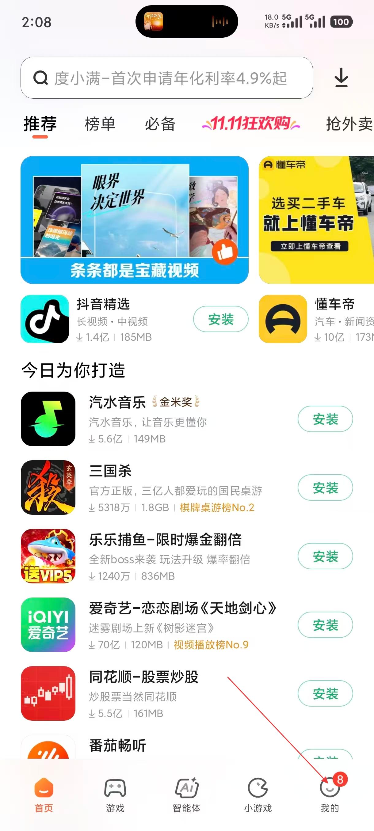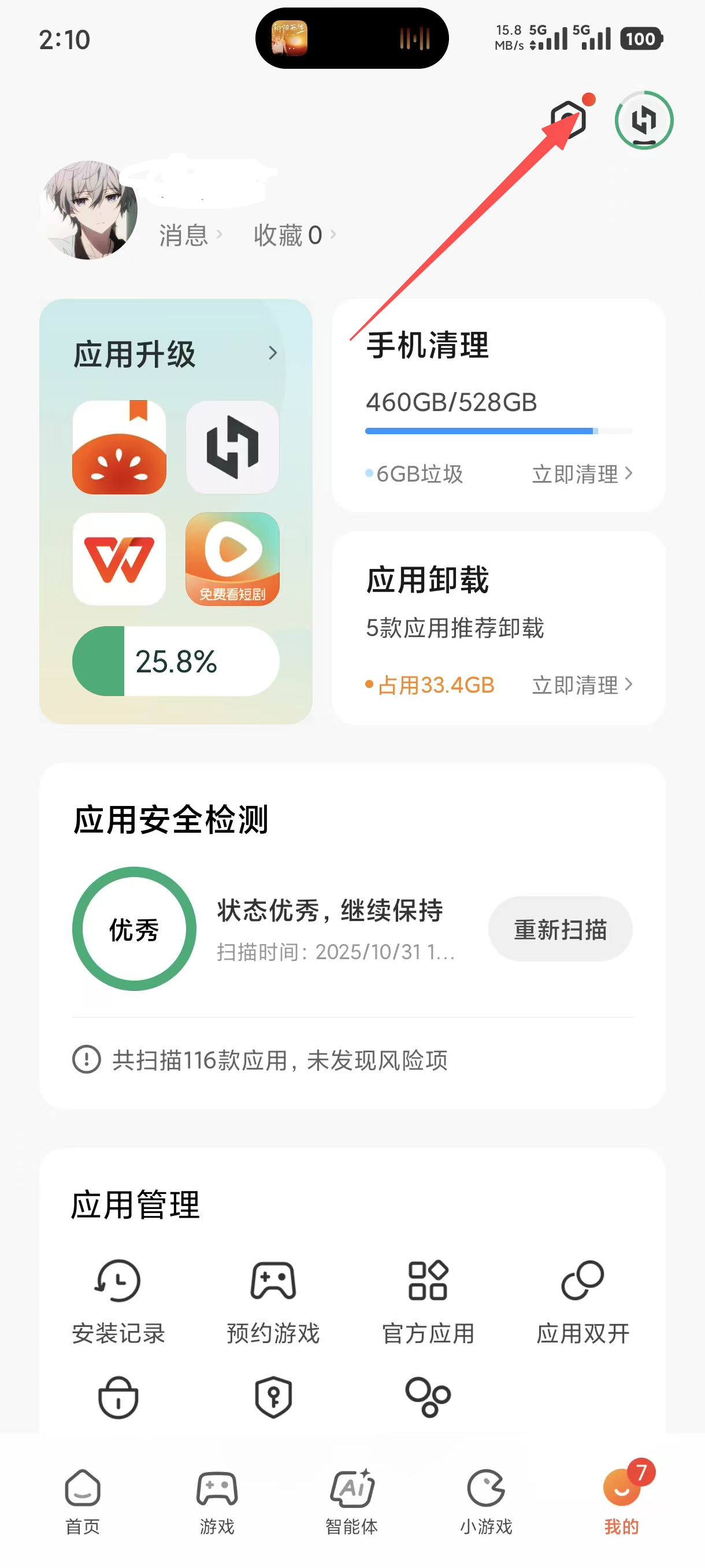 1、在应用商店首页,点击右下角【我的】按钮,可进入个人中心,查看应用升级、手机清理等功能入口。