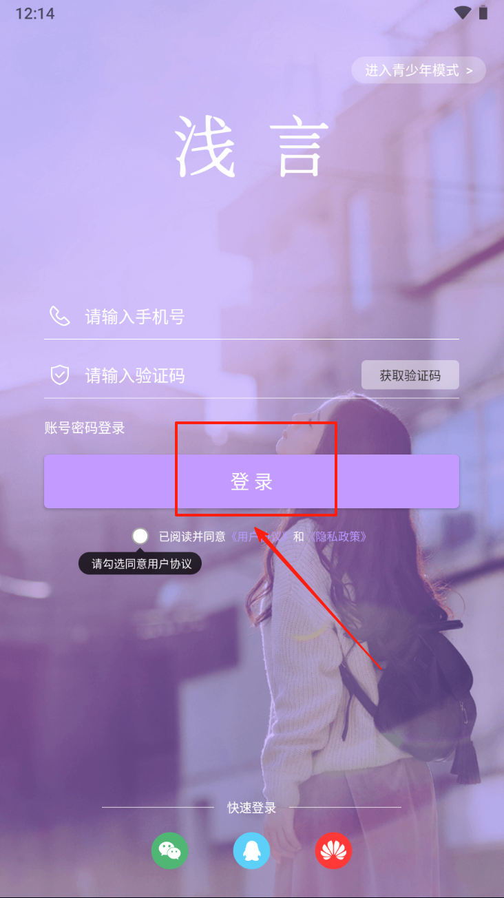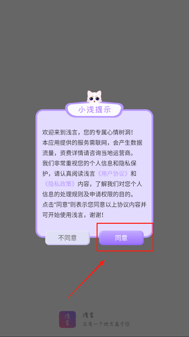 1、点击“同意”按钮,接受用户协议和隐私政策,开始使用浅言。