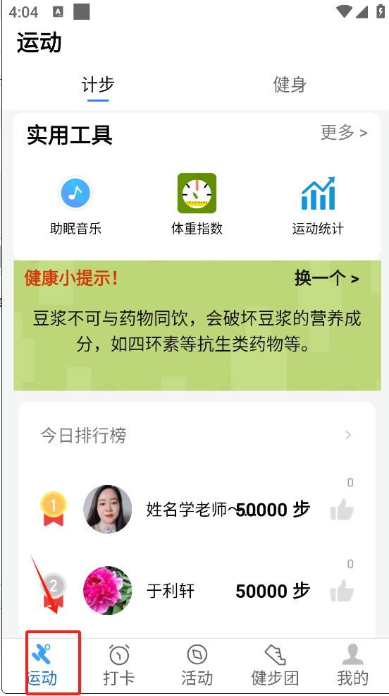 1、点击底部导航栏中的“运动”图标,即可查看计步、健身等实用工具和健康小提示。