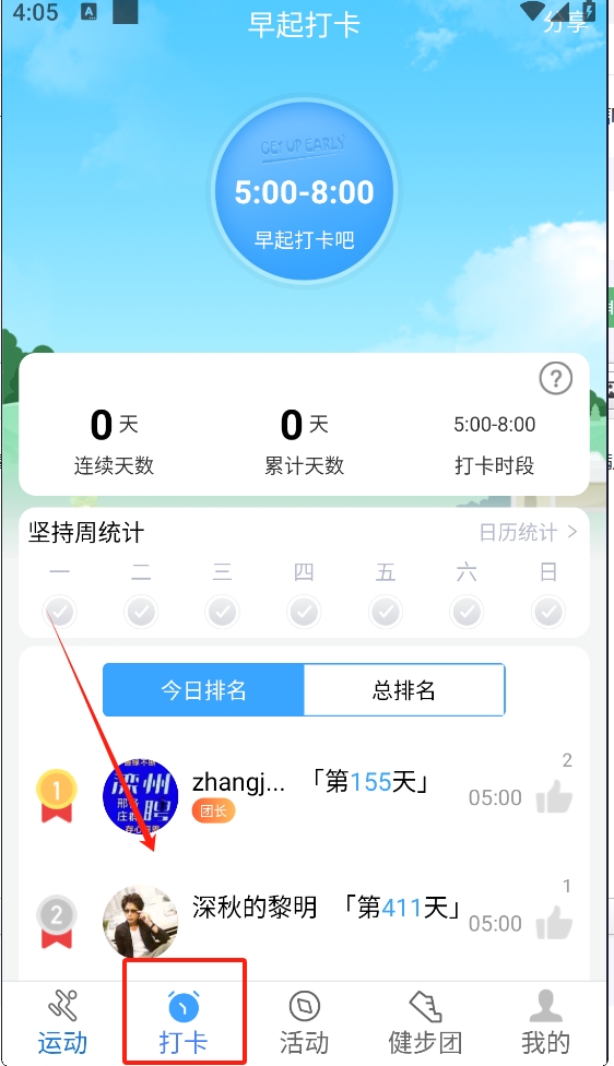 2、点击底部导航栏中的“打卡”图标,进入早起打卡页面,记录您的早起习惯。