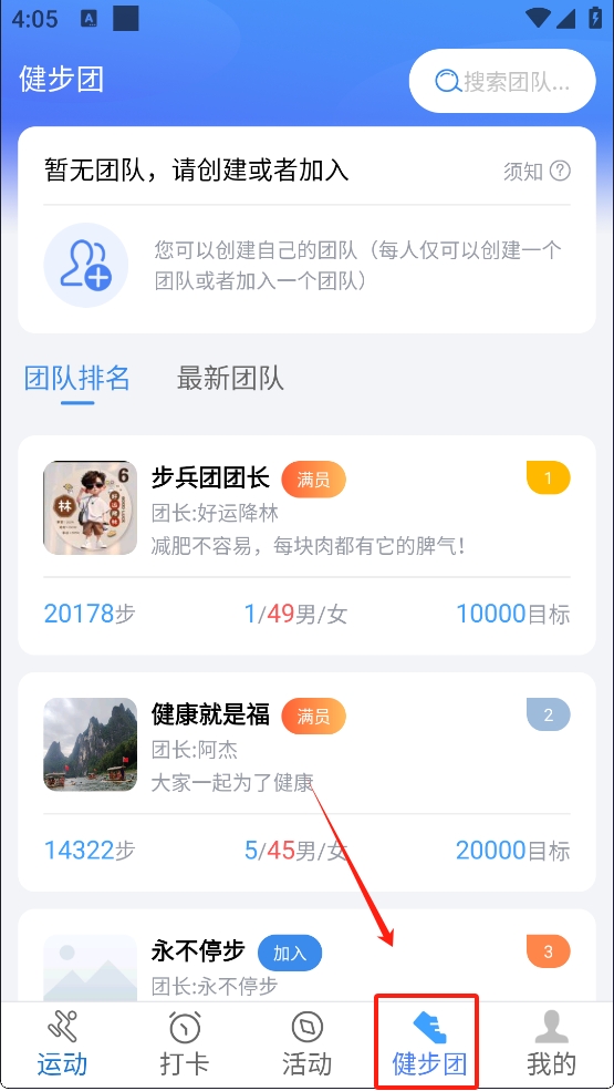 4、点击底部导航栏中的“健步团”图标,选择或创建团队,与他人一起进行健康管理。