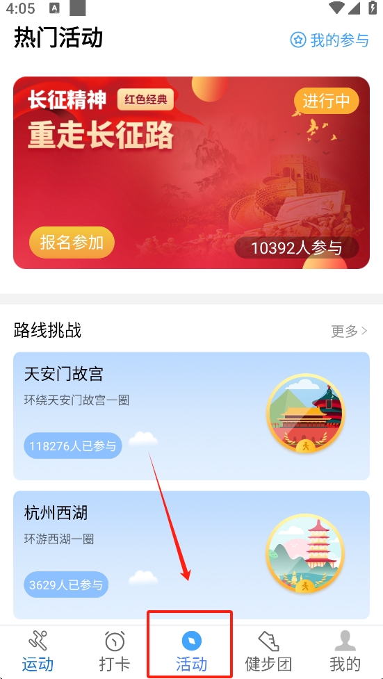3、点击底部导航栏中的“活动”图标,浏览当前热门活动和路线挑战,参与其中。