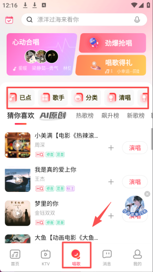 3、点击“唱歌”按钮,选择想唱的歌曲进行在线K歌。