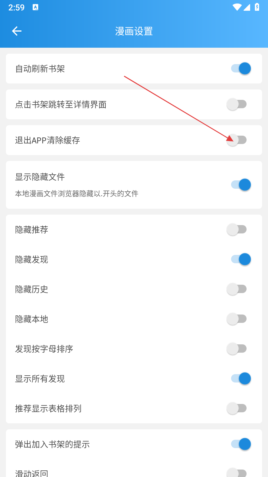4、在漫画设置页面找到【退出APP清除缓存】选项,开启该功能,退出APP时将自动清除缓存,释放手机存储空间。