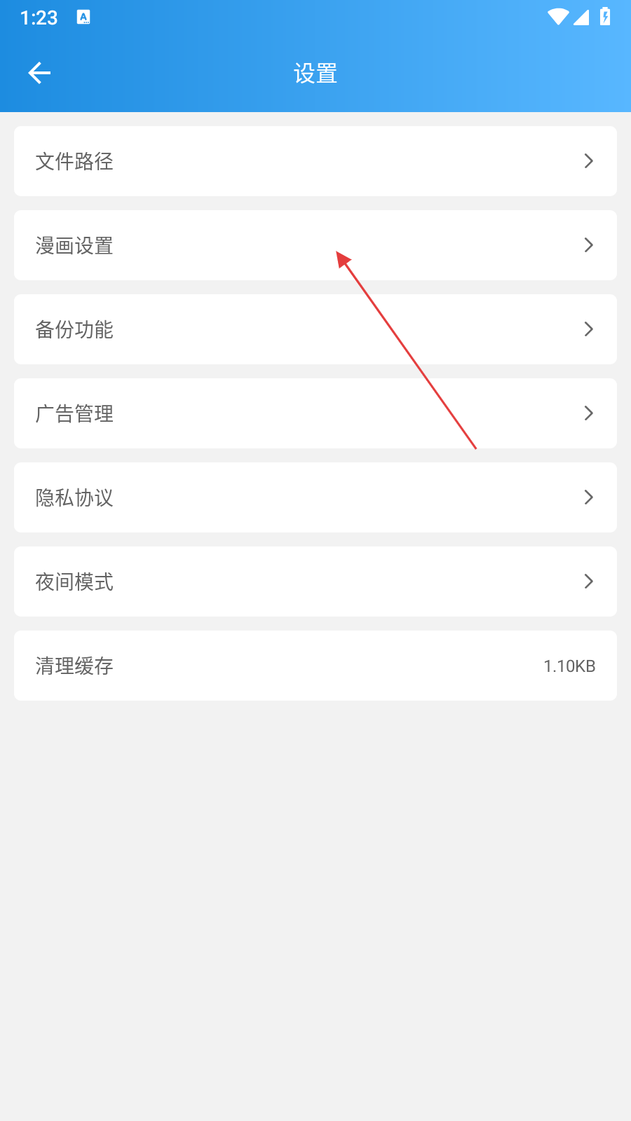 3、在设置页面找到【漫画设置】选项,点击进入漫画设置页面。