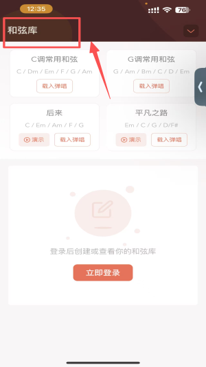 2、选择和弦,点击“和弦库”图标,选择需要练习的和弦组合。