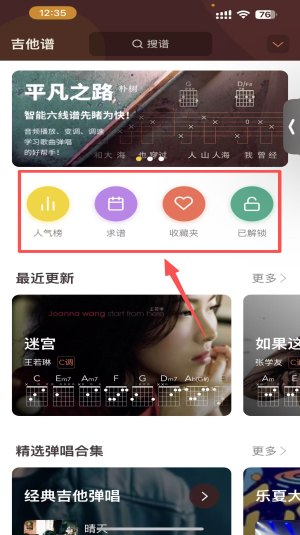 3、查看吉他谱,点击“求谱”图标,搜索并查看吉他谱。