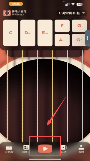 1、开始弹奏,点击底部的“播放”按钮,开始吉他弹奏练习。