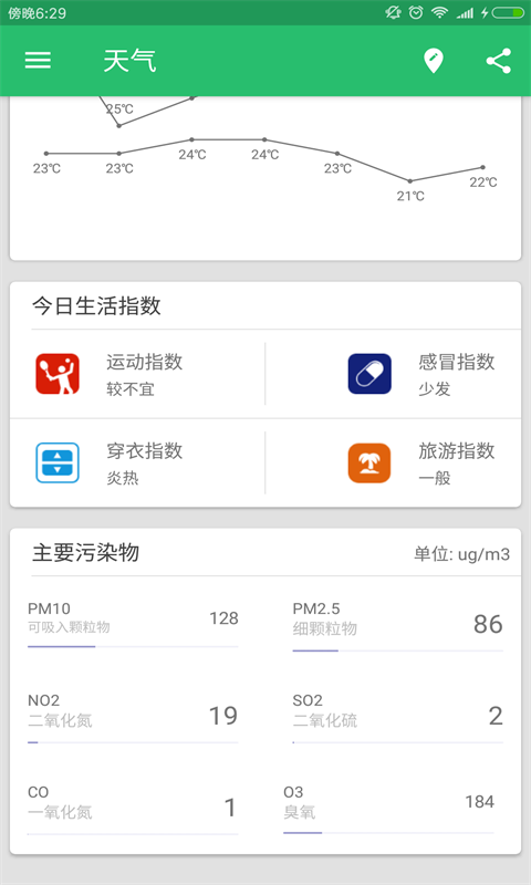 4、不断更新最新的实时温度湿度百分比能见度紫外线指数最大阵风和风向等。
