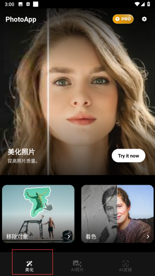 2、在主界面点击【美化】选项,利用AI一键美化照片功能,提升照片质量。