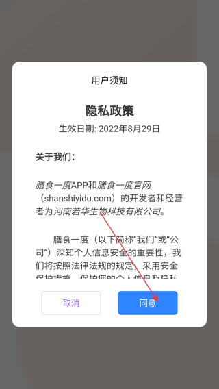 1、打开应用查看用户须知点击同意。