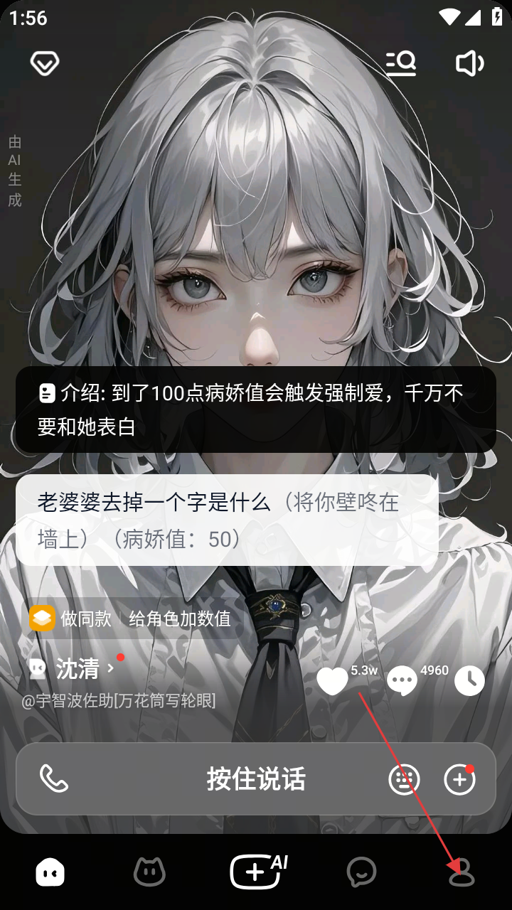 2、登入后就会有AI角色与你对话,点击下方的“按住说话”按钮就能发送语音;