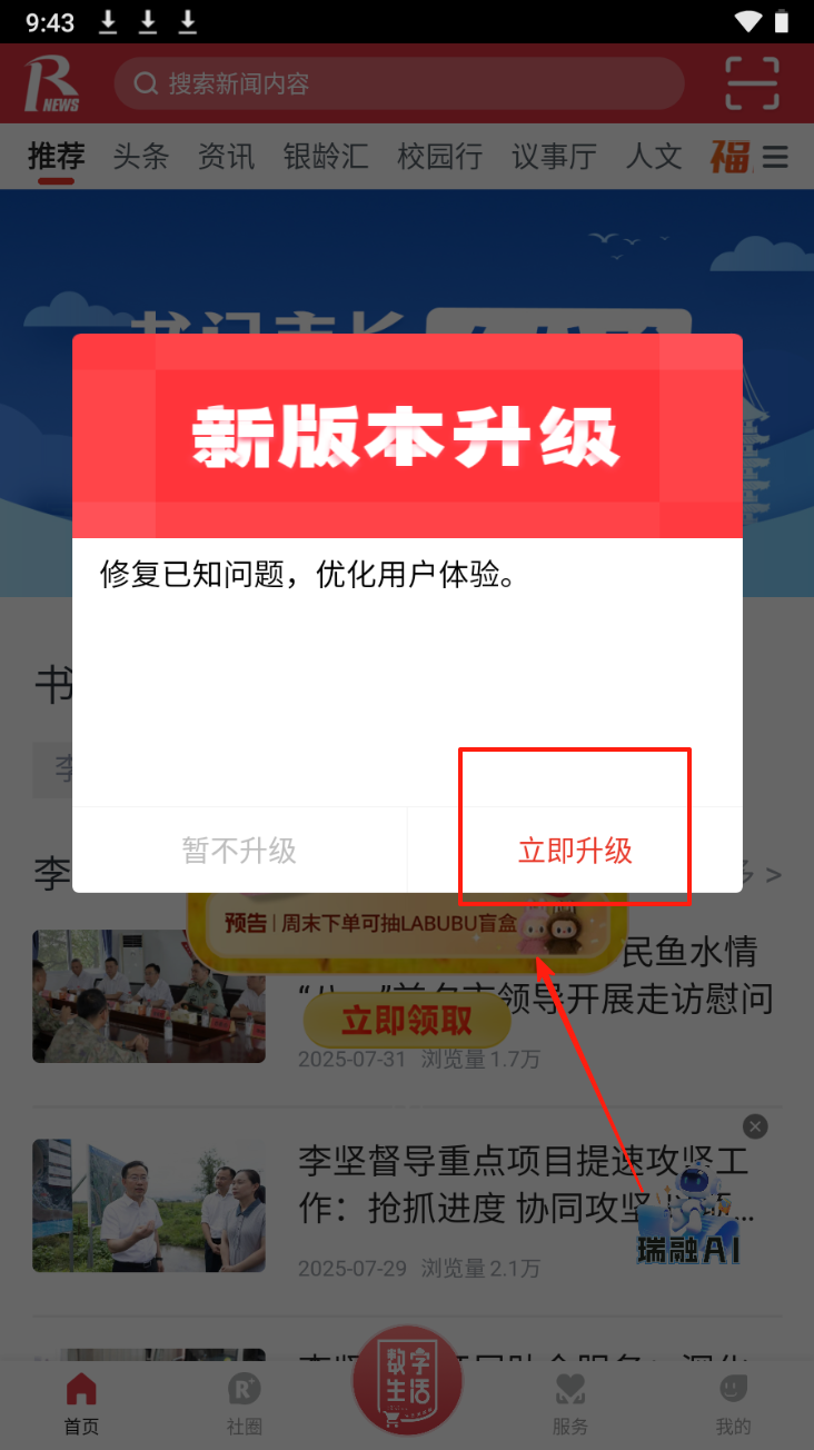 3、升级应用版本:在弹出的版本升级提示中,点击“立即升级”以优化用户体验。