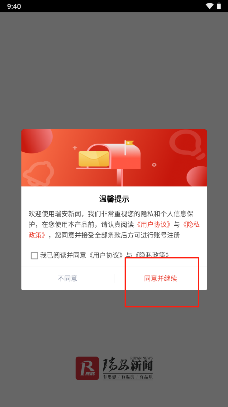 1、同意用户协议和隐私政策:阅读并勾选同意《用户协议》与《隐私政策》,点击“同意并继续”。