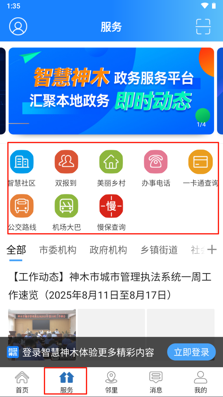 1、点击“立即体验”按钮。进入应用首页,开始探索智慧神木的各项功能。