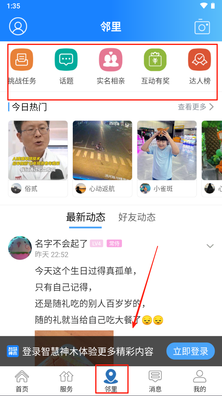 4、查看邻里动态。点击“邻里”图标,浏览社区内的最新动态和热门话题。