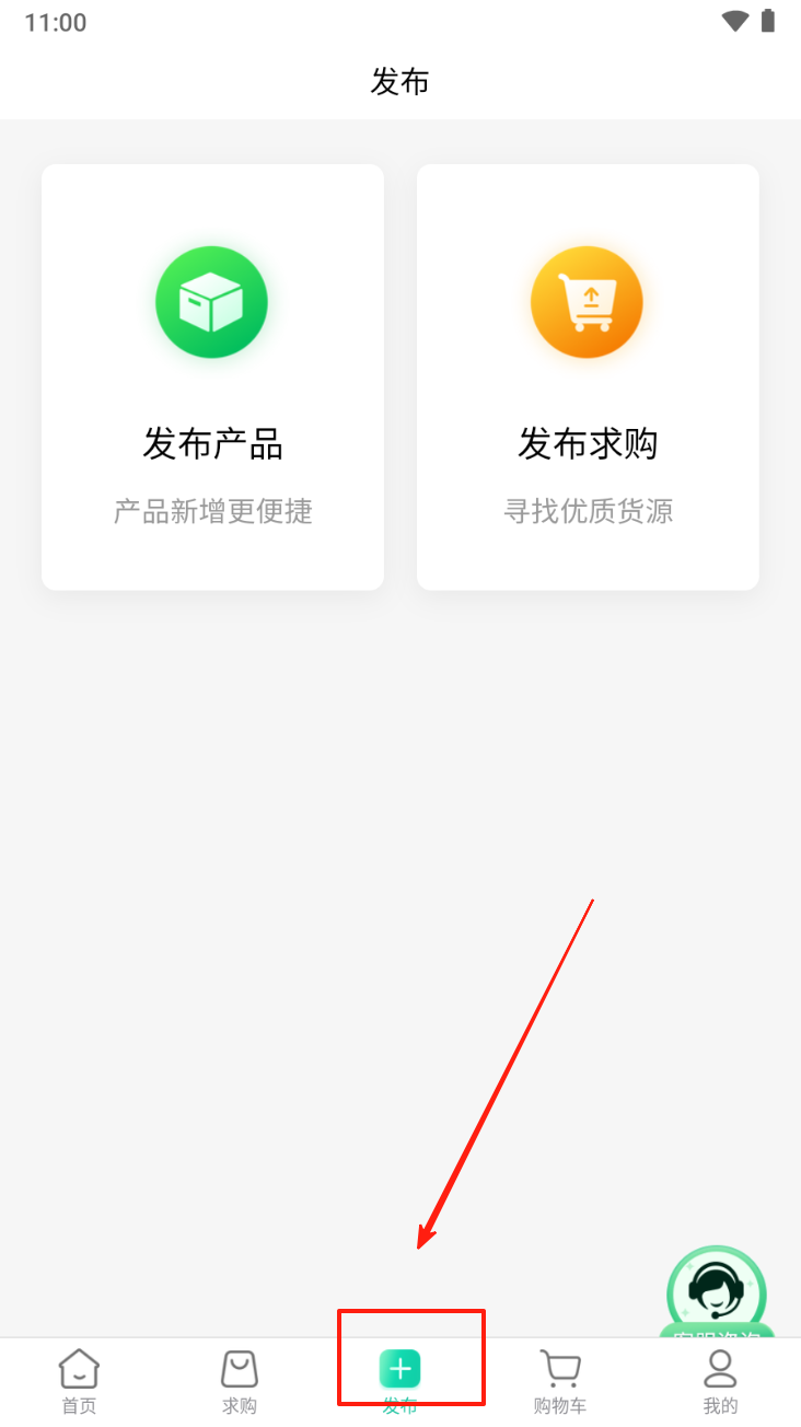 3、在发布页面,点击底部导航栏的“发布”图标,选择发布产品或求购信息。
