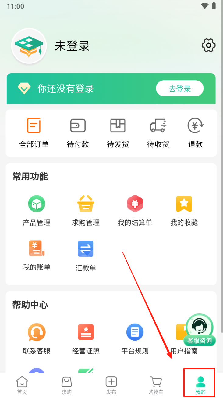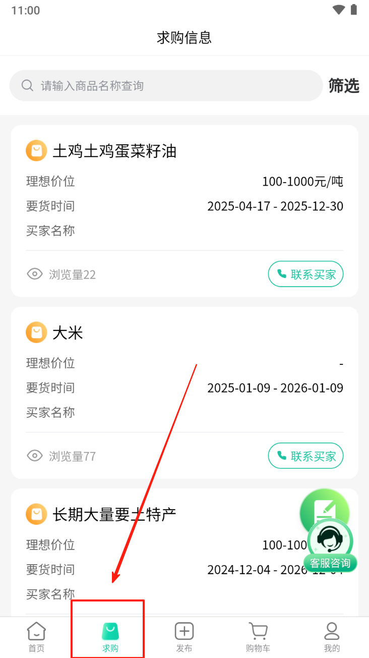 2、在求购信息页面,点击底部导航栏的“求购”图标,查看求购信息并联系买家。
