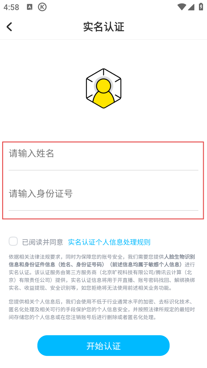 4、进入实名认证页面后,输入姓名和身份证号,勾选同意相关规则,点击【开始认证】按钮。