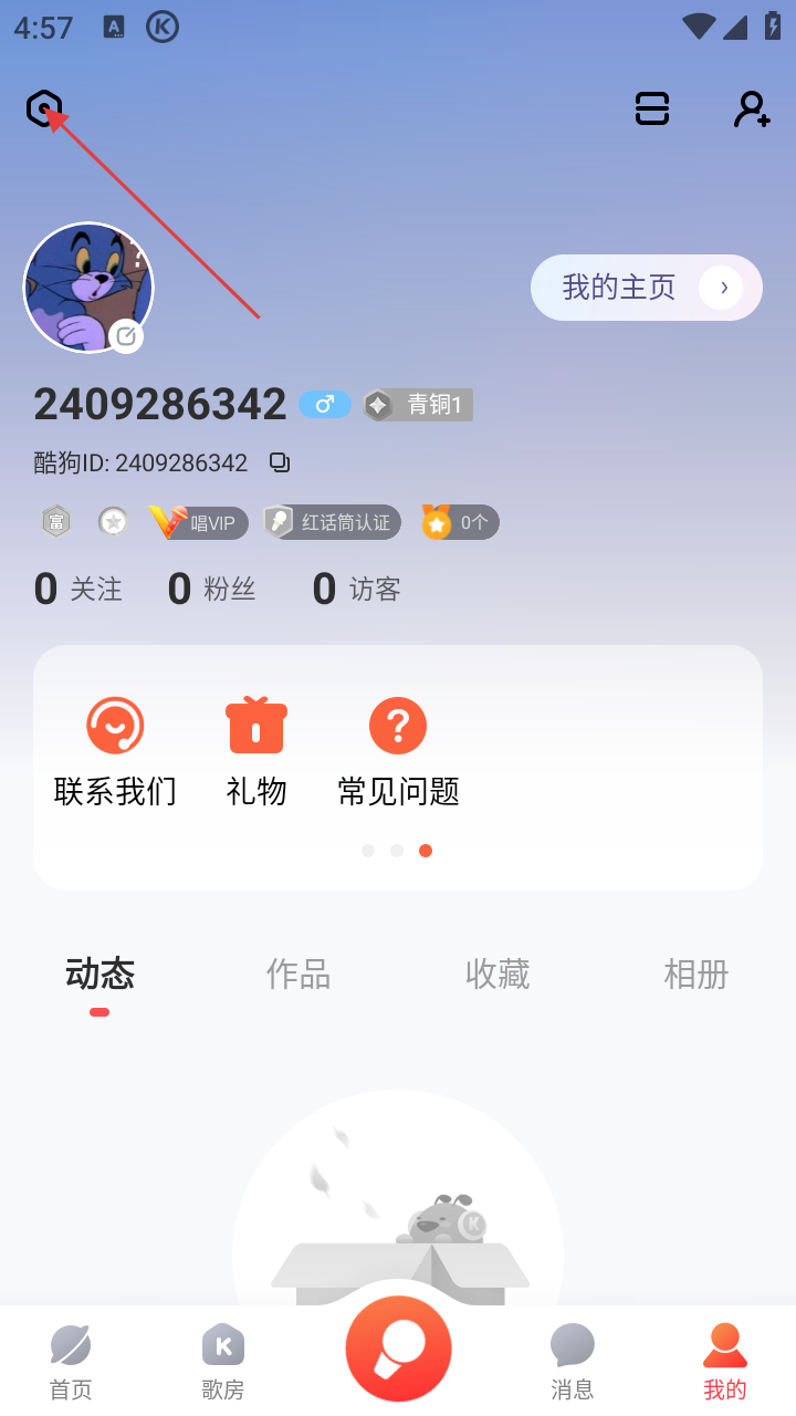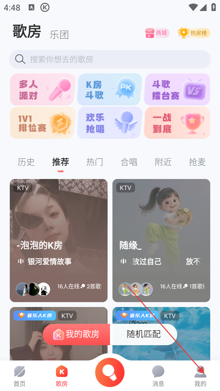 1、在歌房页面,若要进入个人相关页面,点击右下角【我的】选项。