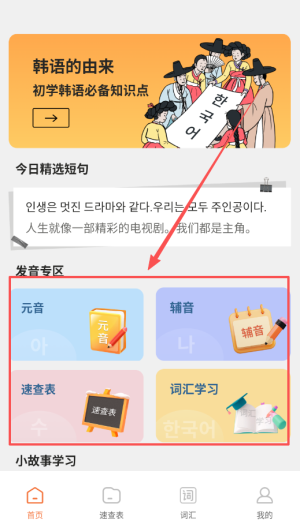 1、首先,下载安装韩语入门学习助手后,用户可在主界面选择学习模块,除了基础知识外,还能寻找短句和故事。