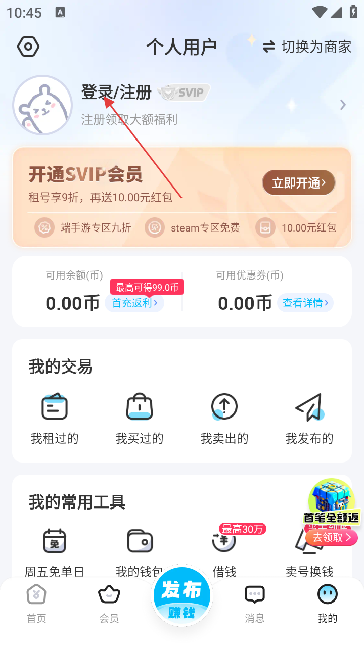 1、在虚贝APP首页,点击右下角【我的】按钮,进入个人中心,可查看登录状态、交易记录等入口。