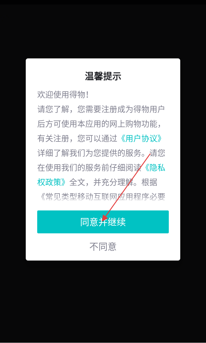 1、在得物温馨提示弹窗里,仔细阅读后,点击【同意并继续】按钮。