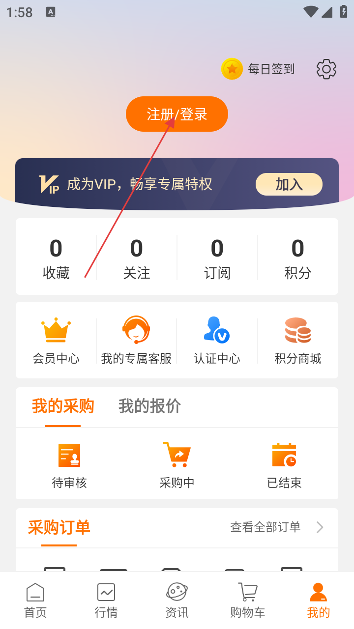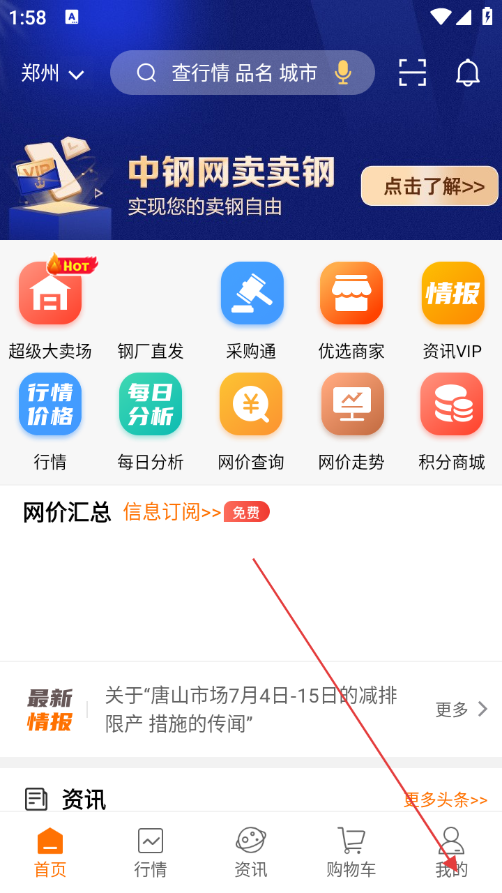 1、打开中钢网应用进入首页点击底部【我的】进入个人中心。