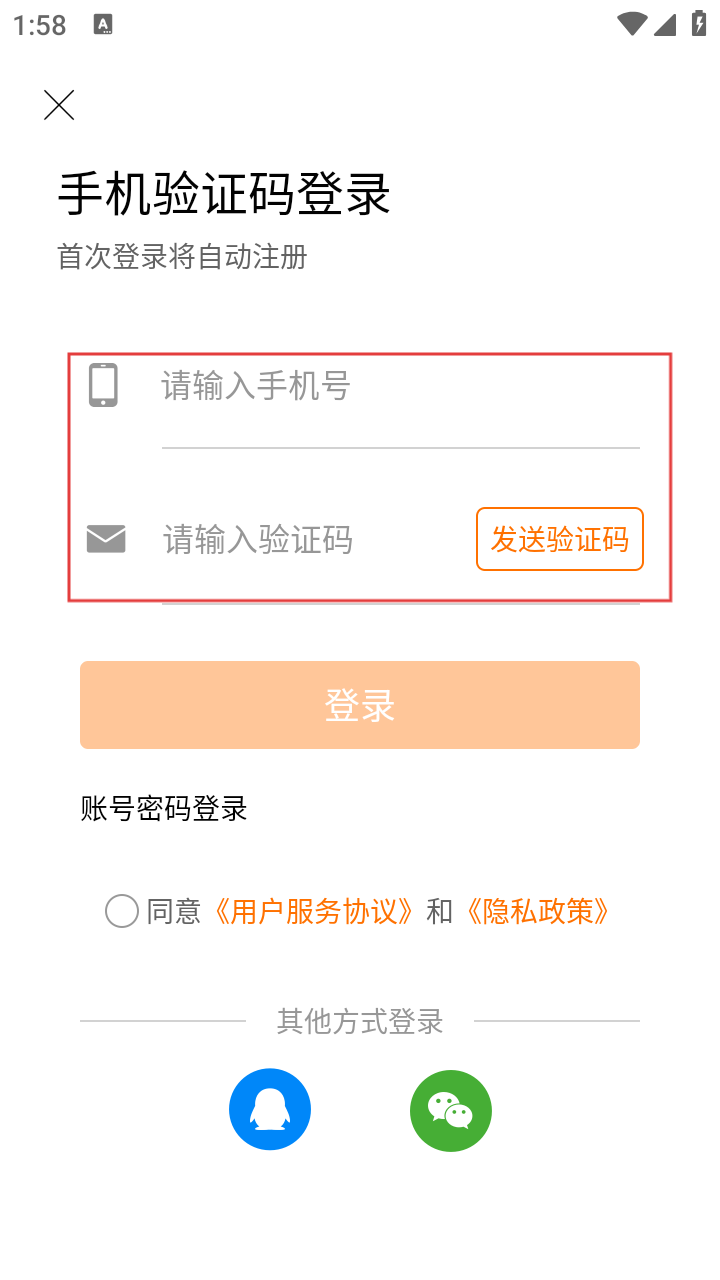 3、选择手机验证码登录,输入手机号,点击【发送验证码】并填写。