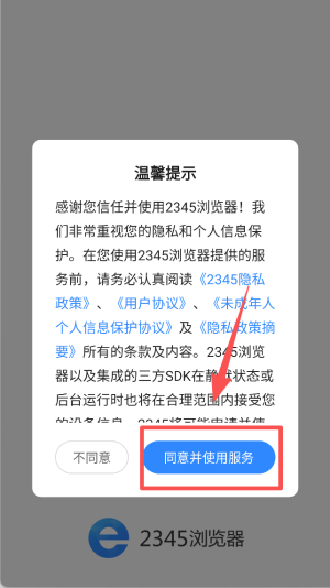 1、启动2345浏览器后,在隐私弹窗里勾选“同意”,再点“并使用服务”跳过首屏声明。