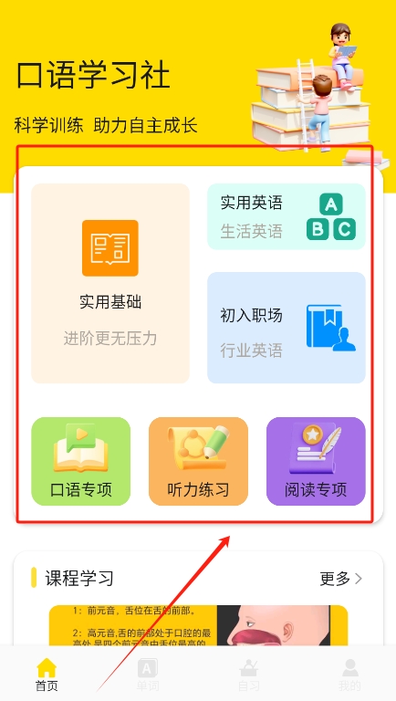 2、其次,选择您想要学习的内容,例如词汇,听力或口语练习,帮助您更高效地提高英语能力。